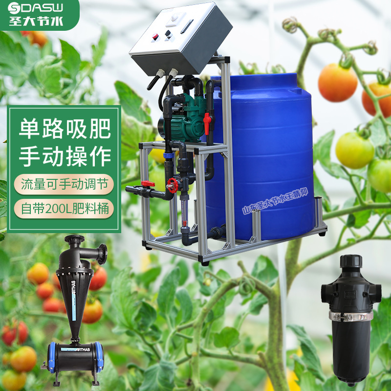 圣大節(jié)水SD-WFSD-A01通道施肥機(jī)由手動(dòng)/自動(dòng)按鈕、指示燈、優(yōu)良文丘里、耐腐蝕PVC管材管件、開關(guān)機(jī)控件、吸肥泵動(dòng)力系統(tǒng)等部件組成。