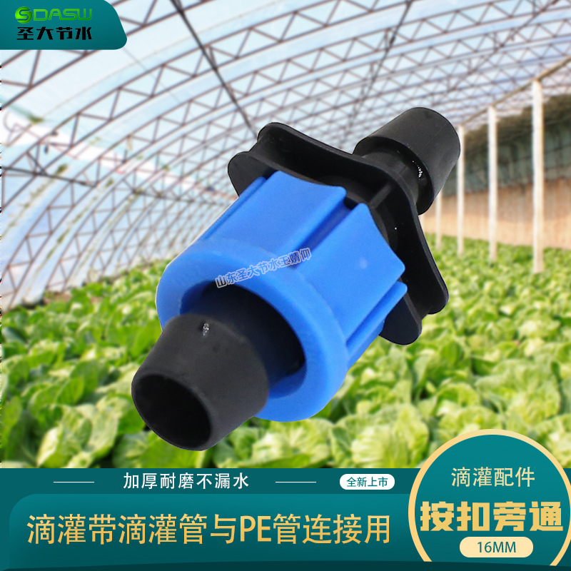 山東圣大節(jié)水生產(chǎn)的滴灌鎖母按扣旁通,規(guī)格16mm,螺紋連接,安裝方便,滴水均勻,不堵塞。